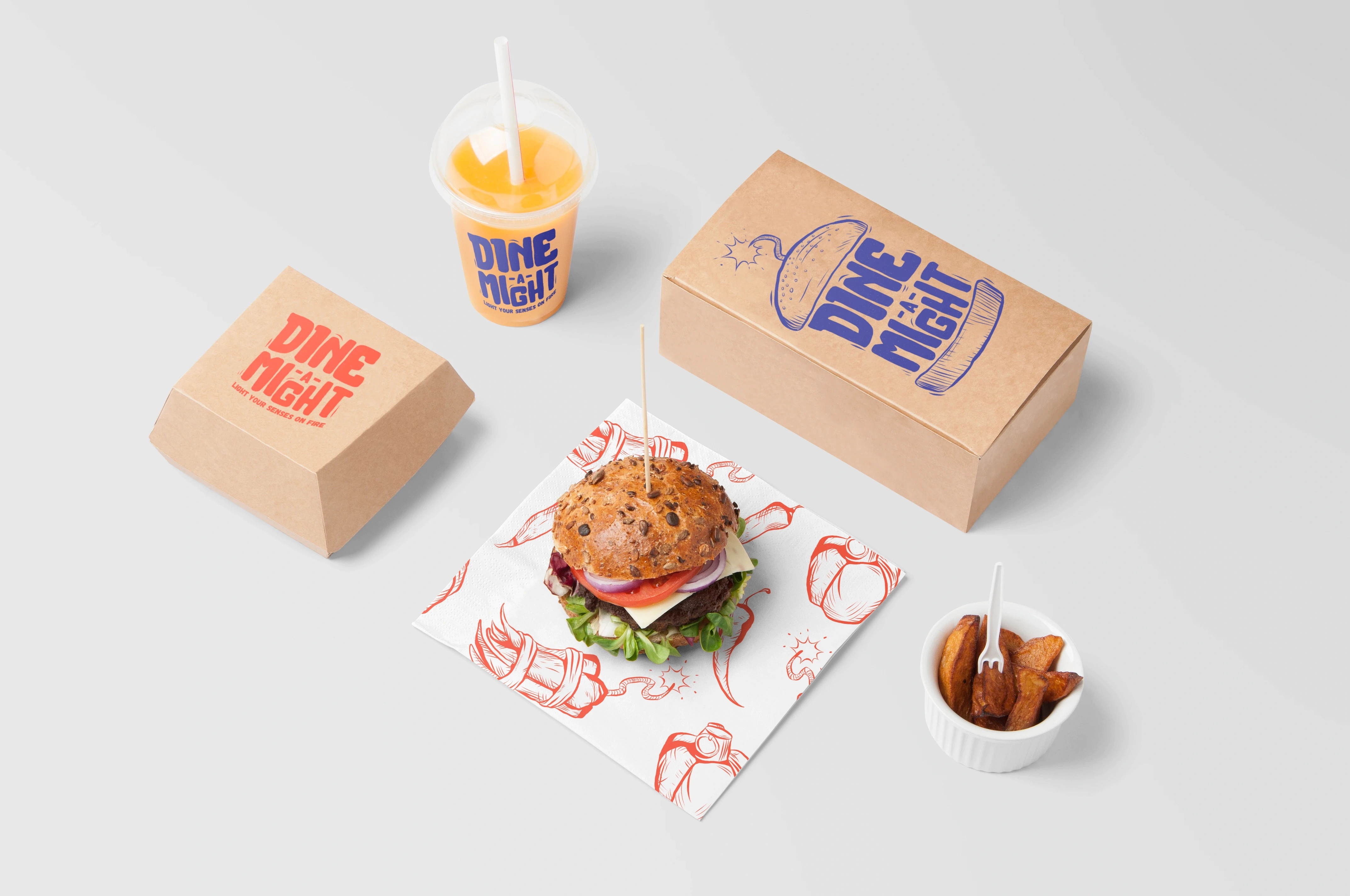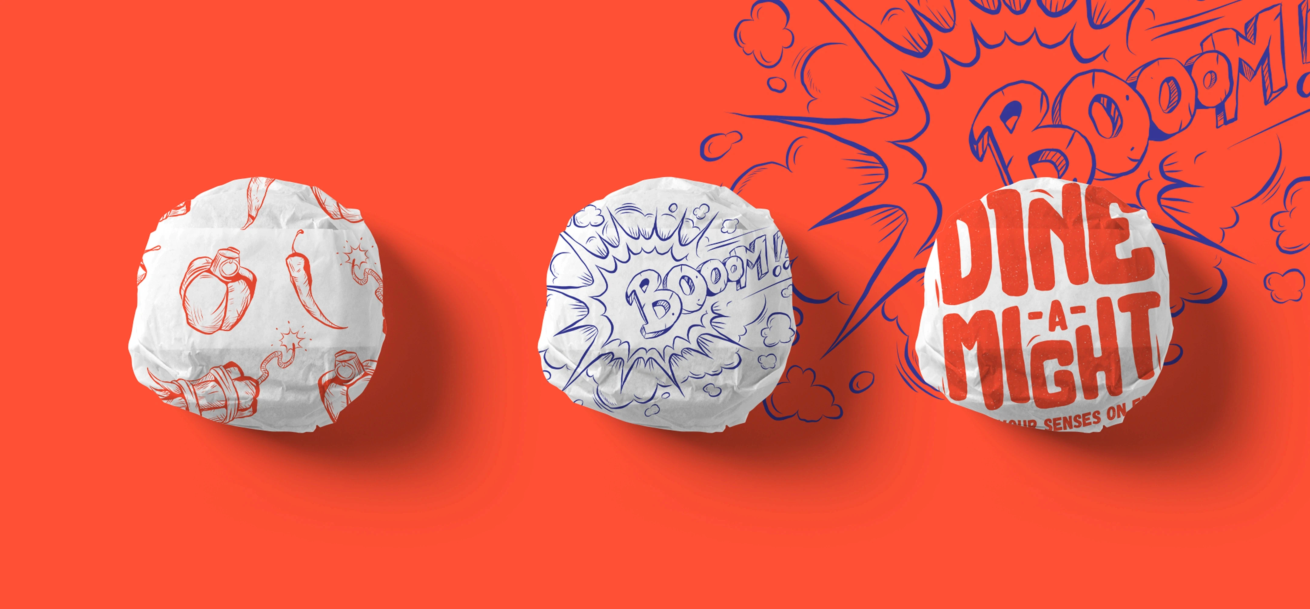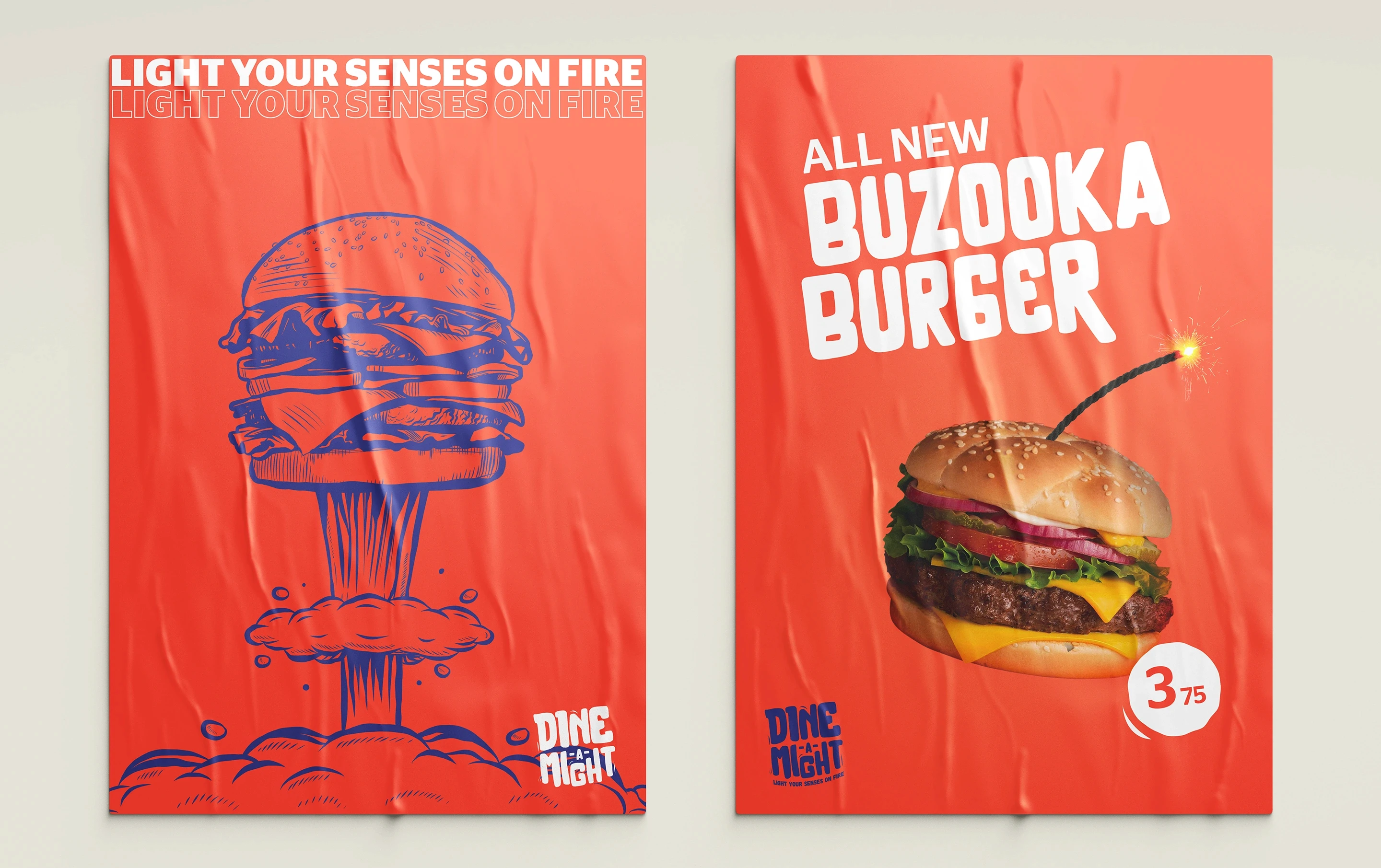 Dine-a-Might was a fun one. The idea started from a fictional backstory about two veteran brothers starting a battlefield-themed burger joint, and I saw it as a chance to build a brand that doesn’t take itself too seriously but still feels tight and well put together.